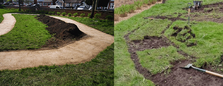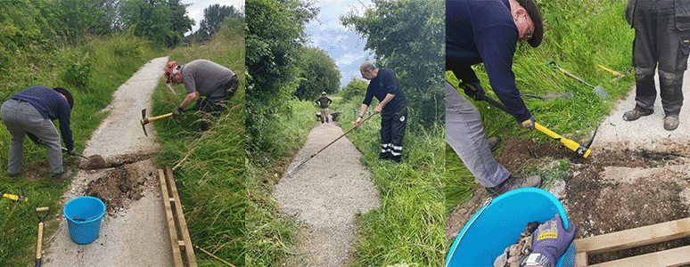 Our volunteers returned to a job which they had started a while back. The finishing of a path, first digging out the edges of grass. Ready for the stone. Two soak away drains have been installed at two locations along a section of the path too. The work has been completed by members of Derby Parks Volunteers and The Friends of Sinfin Park, both groups and organisations coming together to achieve a fantastic outcome.
